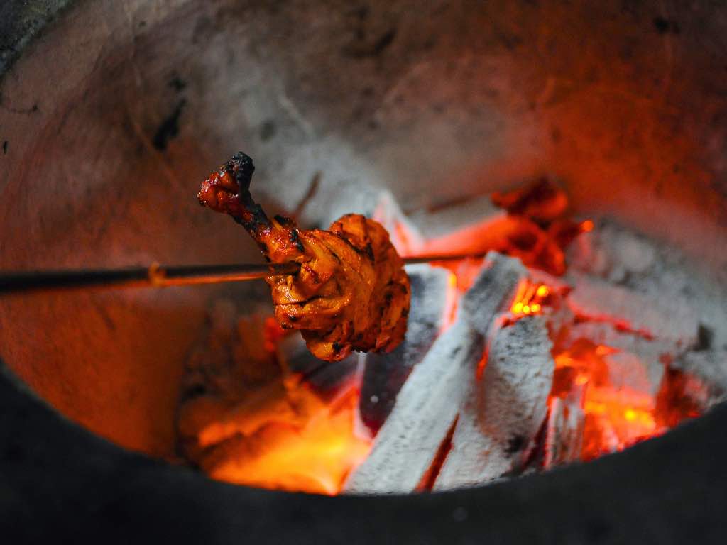 Cooking process: Place the skewers inside the preheated tandoor, ensuring they are suspended vertically without touching the sides. Cook the chicken for approximately 15-20 minutes, rotating the skewers occasionally to ensure even cooking. The chicken is done when cooked and has a slightly charred exterior. Keep a close eye on the chicken to avoid overcooking and drying the meat.